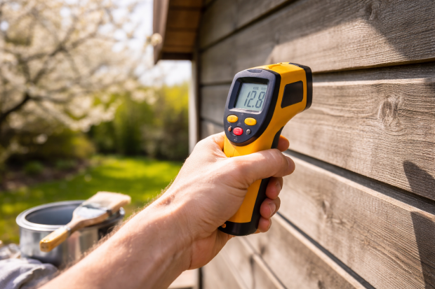 Mål temperaturen på selve træoverfladen, ikke bare i luften. En digital overfladetermometer koster under 200 kr og giver dig et præcist svar. Solbeskinnede brædder kan være 10 grader varmere end lufttemperaturen, mens nordsiden kan ligge flere grader under.